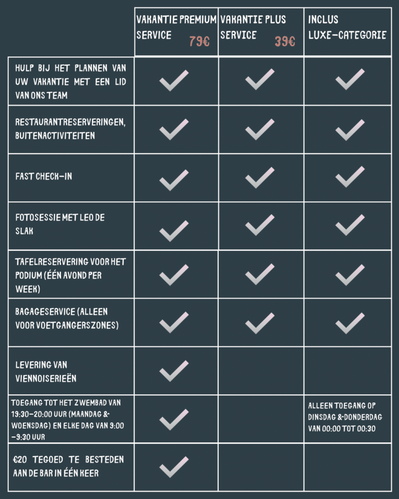 Bekijk onze vergelijkende tabel om alle beschikbare opties te ontdekken en de formule te kiezen die perfect bij uw wensen past. Met de Premium Vakantieservice en Vakantie Plus Service wordt uw vakantie een hoogwaardige ervaring, zonder concessies aan plezier en ontspanning.